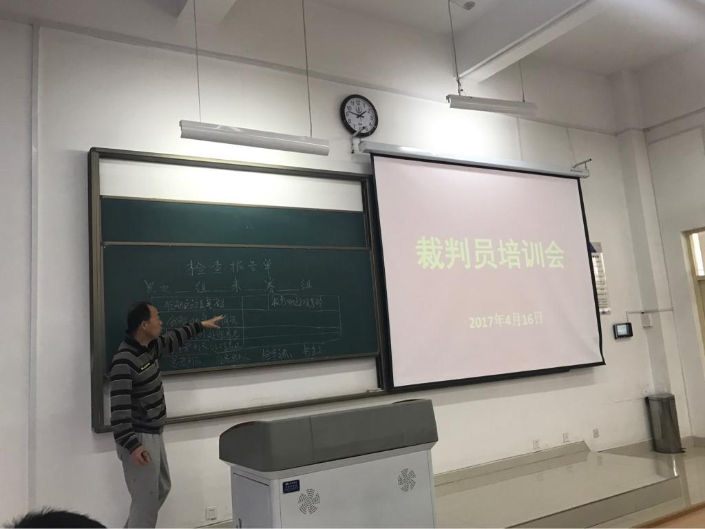 2017年4月16日下午1点,taptap188官网第十一届阳光体育运动会裁判员培训会在鸿远教室1101召开,出席本次培训会的老师有体育系党总支副书记陈沛老师,体育系副主任李新老师,体育系团总支书记田运涛老师,总裁判长王立刚老师,径赛裁判长米战老师,国家taptap点点项目裁判长罗峰老师,趣味项目裁判长张伟老师。此次培训会由总裁判长王立刚老师主持。