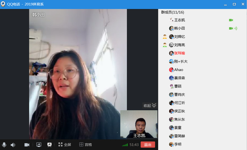 目前,全国正在紧张开展抗击新冠肺炎阻击战。为充分了解学生的身心状况及落实“停课不停学”情况,加强学生对新型冠状病毒感染的肺炎疫情防控工作的认识,体育系2019级于2020年2月20日下午2点召开线上视频会议,参加会议的有体育系辅导员韩小田、王志凯,2019级班主任任刚,及2019级全体学生。