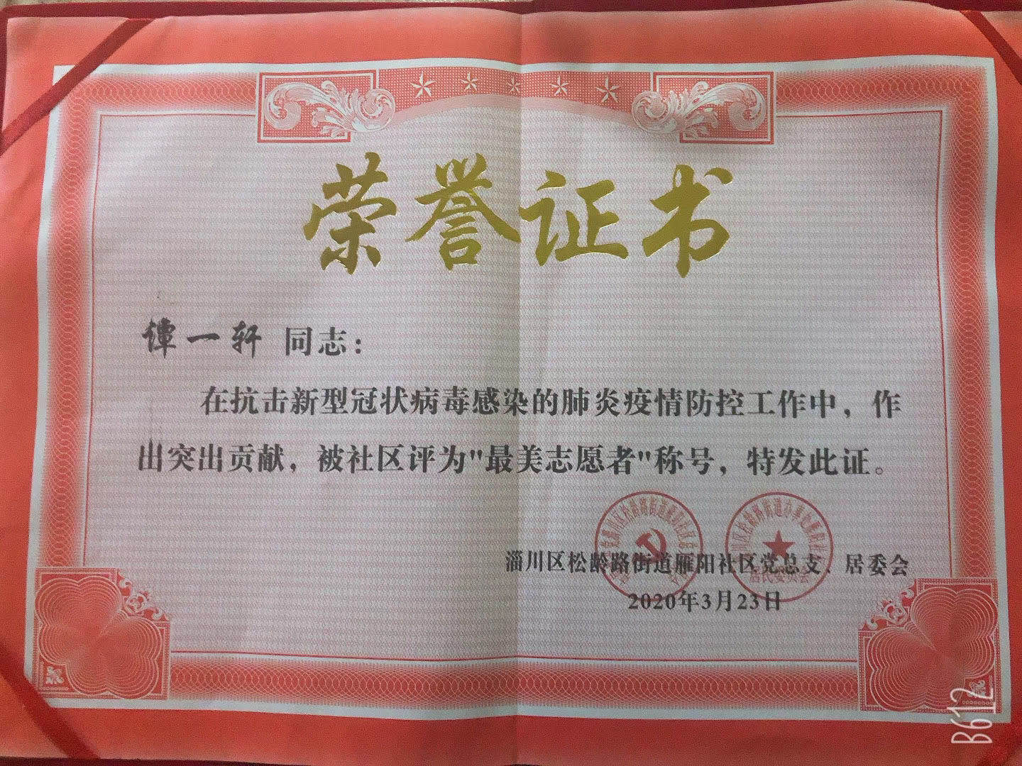 问及其中是否有困难,他说:“困难肯定是有的,没有通行证硬往里闯的,态度语气不好的,想要跟我们执勤人员动手的都很多!”但他和其他工作人员从不抱怨,耐心劝解,都能解决问题。“最美志愿者”的荣誉证书就是对他辛勤工作最好的认可。“形势越来越好,业主们后来也很理解我们的工作,慢慢的自觉起来了,感觉虽然累但是很开心,能为国家和人民作出微不足道的贡献是值得的!”正是由于很多像谭一轩同学这样积极参加社区防疫工作的人,我们才能向胜利一步步迈进。漫漫长夜终将过去,胜利的曙光定在眼前。