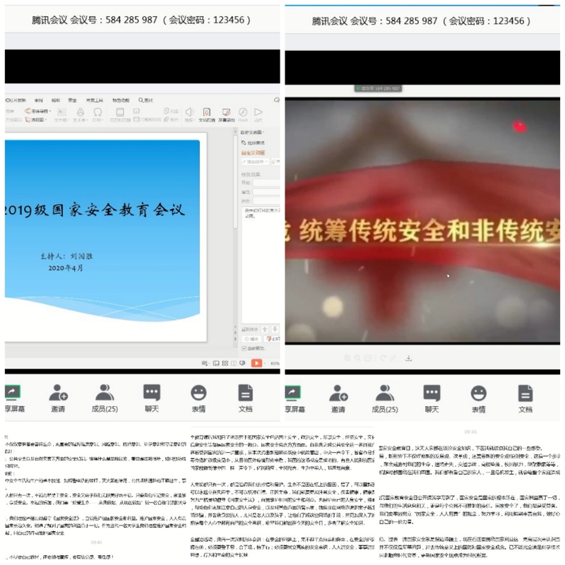 2019级开展了“国家安全教育”的主题班会,“国家安全是国家根本所在,国家利益高于一切,维护国家利益与安全,不仅与我们的生活息息相关,更是每个公民不可推卸的责任”、“天下虽安,忘战必危”等,这是同学们对国家安全的思考,国家安全重于泰山,国家安全人人有责,作为高校学生,我们更应该注意自己的言行,牢固树立国家安全观。