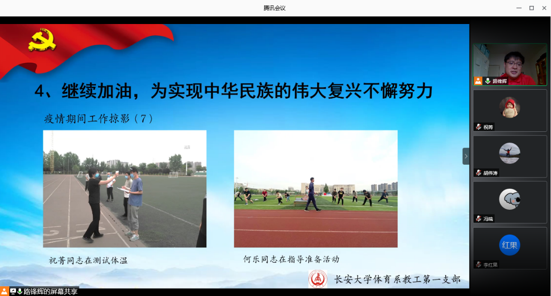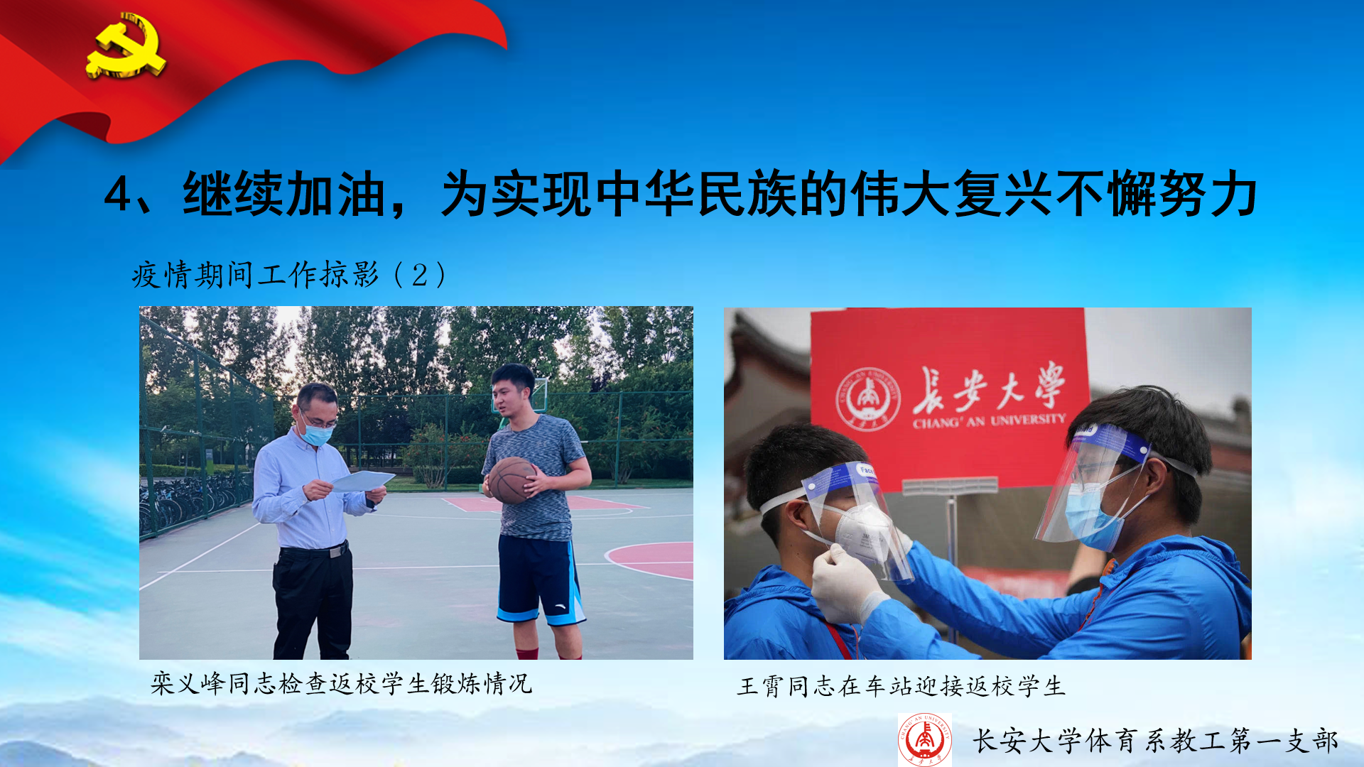 在2020年这个特殊时期,讲好抗疫故事,用体育促进健康,支部党员都参与其中。作为长大体育人,将用行动践行初心使命,助力我校一流高校建设,为中华民族的伟大复兴而努力奋斗。