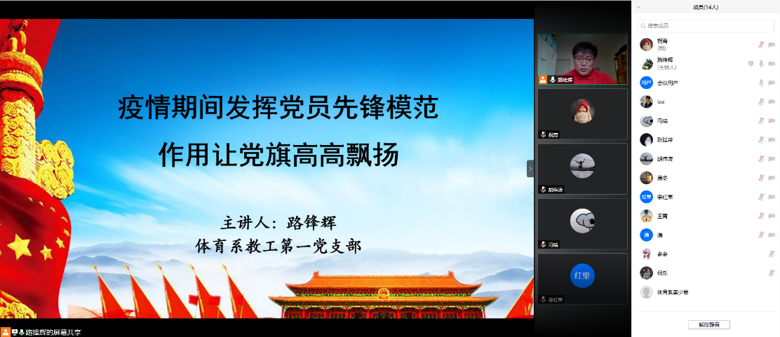 路锋辉围绕疫情期间党员先锋模范作用的内涵和要求,以及如何发挥党员先锋模范作用为全体党员讲党课。强调:第一、党员先锋模范作用主要表现在党员在人民群众中应该生产的影响,在工作、学习和一切社会活动中,通过自己的骨干、带头和桥梁作用,影响和带动周围的群众共同实现党的纲领和路线的行动。其二、疫情期间,广大党员要坚决贯彻习近平总书记的重要指示批示精神,增强防控责任感和紧迫感,全力以赴做好疫情防控工作。同时,要坚守政治纪律、工作纪律和保密纪律,教育引导身边群众识别网络信息,做到不信谣、不造谣、不传谣,维护大局稳定。最后,结合疫情期间居家锻炼和和体育教学、体育扶贫等情况进行了阐述,尤其当前部分学生存在应用体育运动的意识和能力相对有限之问题等。