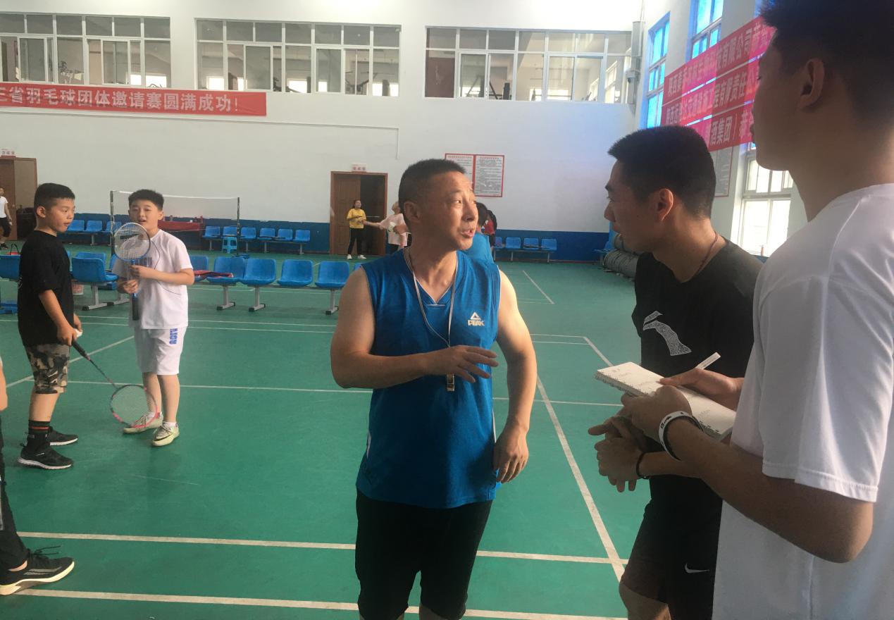 实践队员在与商南县运动学校的羽毛球老师交流,了解商南县体育馆羽毛球课和基层羽毛球比赛开展情况。