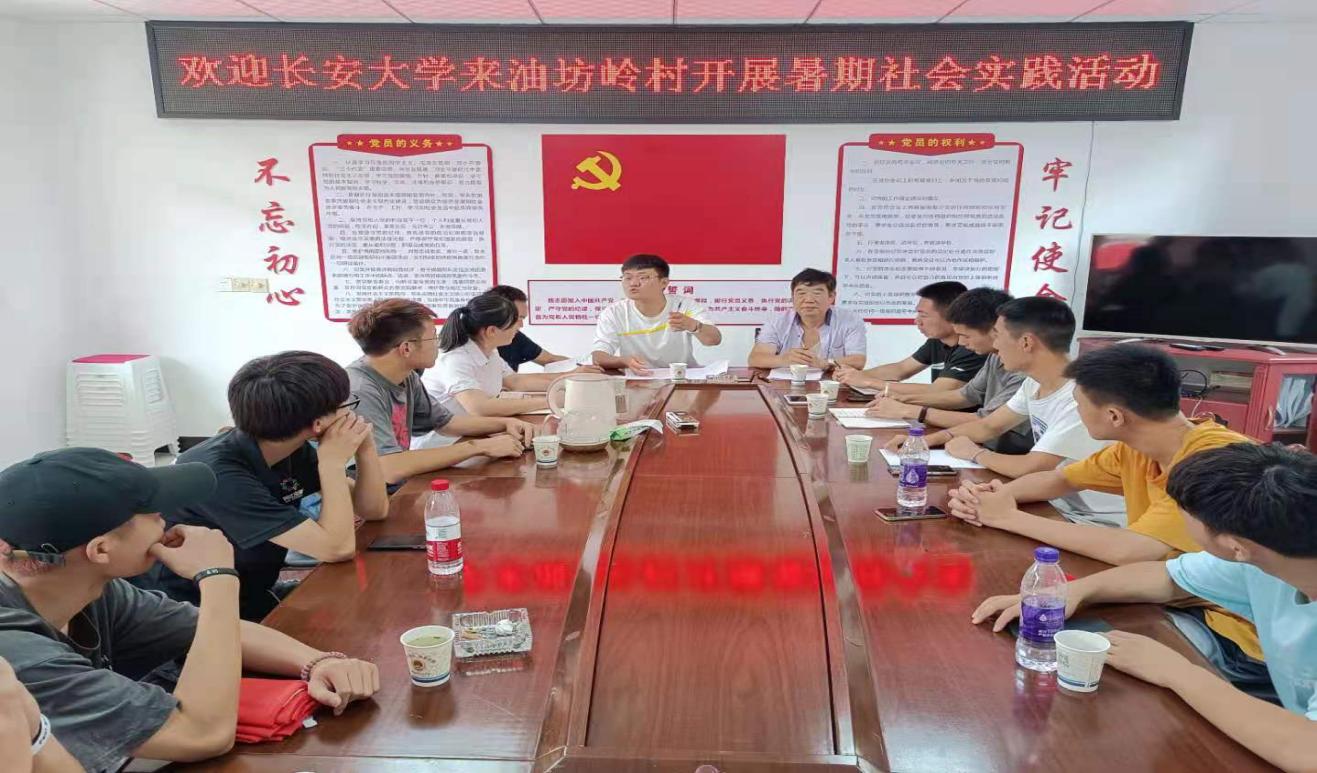 实践队师生与油坊岭村党支部书记陈明清及村部成员座谈,畅谈校地合作及社会实践等事宜。
