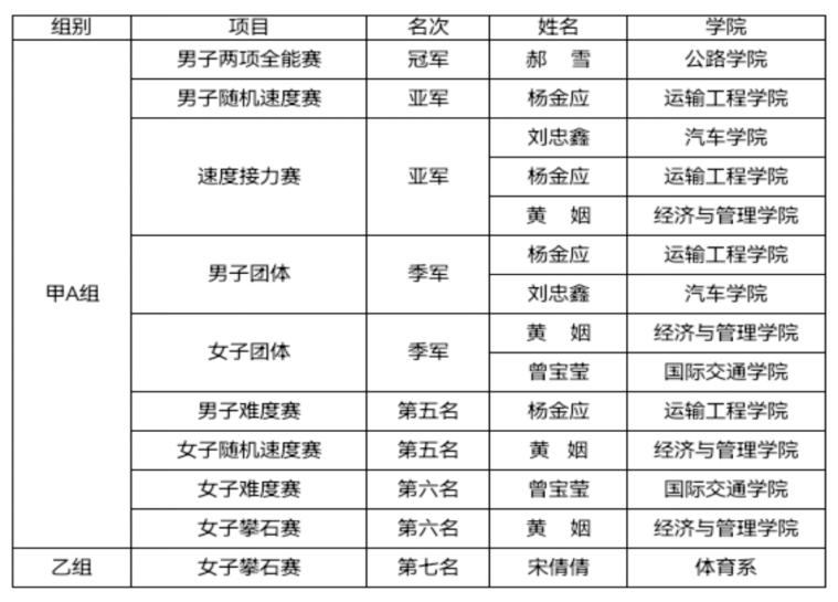 第19届中国大学生攀岩锦标赛我校参赛队员获奖情况