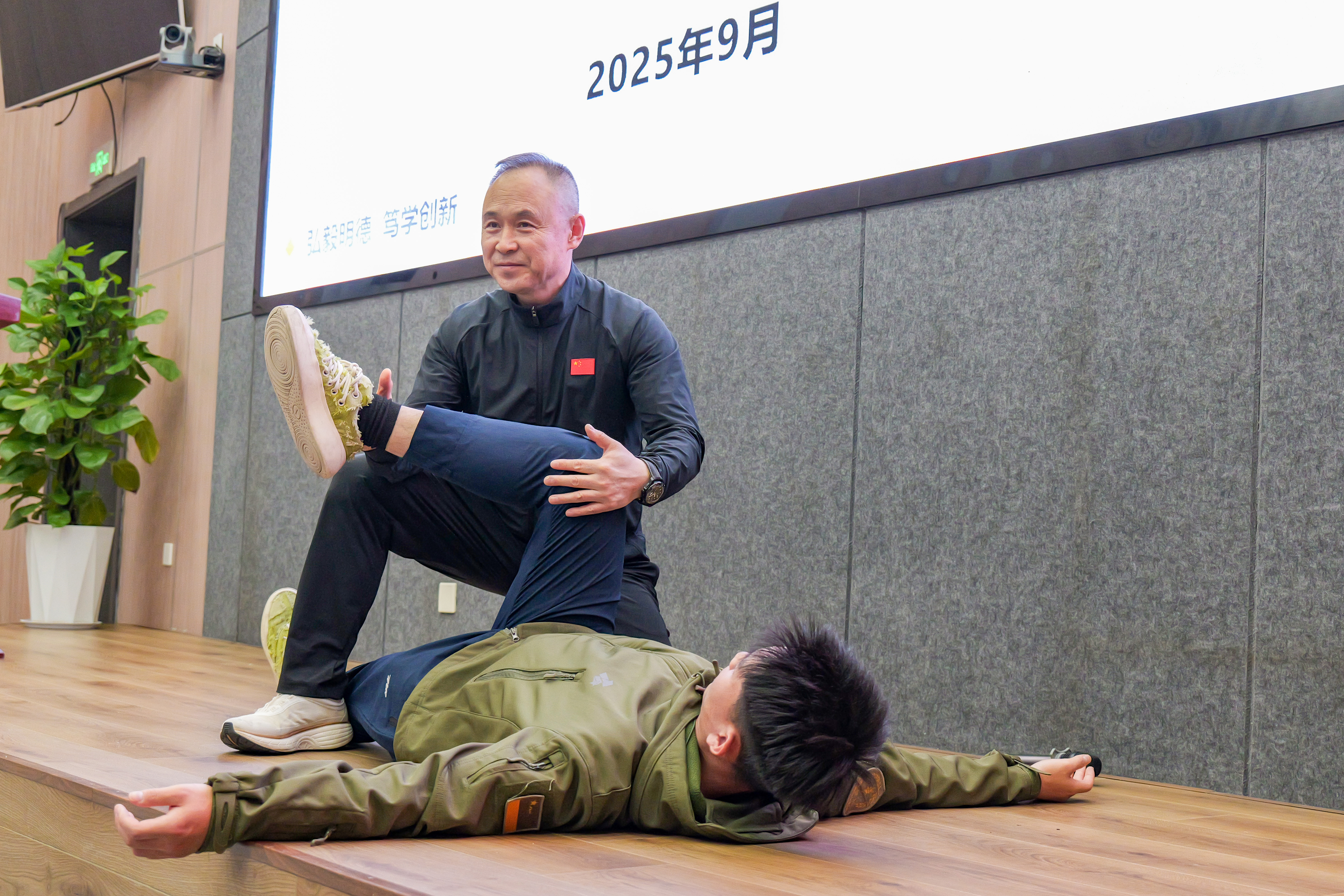 最后,牛雪松与在座的青年教师和研究生们进行深切交流。提问环节中,与会师生向牛雪松教授围绕有关自身伤病如何康复的问题踊跃提问。牛雪松教授与在场青年师生积极探讨,并对于师生提问进行了深入解答,他热情地进行示范,并邀请同学上台仔细演示,进行正确科学的动作教学,帮助同学进行恢复。